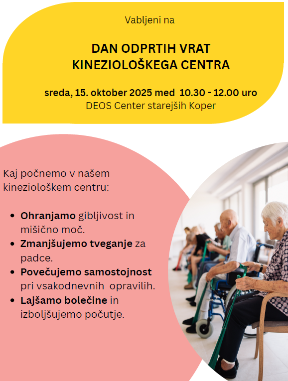 Vabljeni na Dan odprtih vrat Kineziološkega centra, ki deluje v okviru Zavoda Aktivna starost, v prostorih Centra starejših Koper. Dan odprtih vrat bo potekal v sredo, 15. oktobra, med 10.30 in 12. uro.