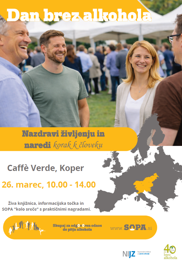 Nacionalni inštitut za javno zdravje, Območna enota Koper, v sodelovanju s Caffè Verde, vabi v četrtek, 26. marca, med 10. in 14. uro, v kavarno Caffè Verde v Kopru (Verdijeva ulica 5) na dogodek Dan brez alkohola.
